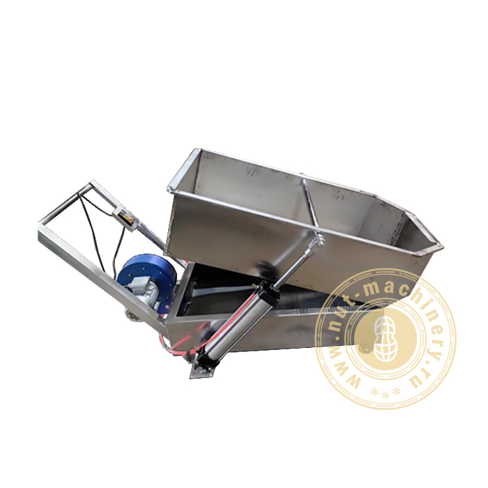 Машина для охлаждения жаренного арахиса ОР-150 конструктивно очень проста. Она смонтирована на сварной раме с небольшими роликовыми колесами. Для удобства перемещения предусмотрена еще и ручка-толкатель. Рама и детали привода изготовлены из углеродистой стали. Все детали соприкасающихся материалов выполнены из нержавеющей стали. Основное в ней – это корыто, куда сгружается горячее сырье. Верхняя часть корыта имеет борта и днище в виде сита, что необходимо для упрощенного доступа к сырью охлаждающих потоков воздуха. Такие потоки создаются нагнетающим вентилятором с прямым приводом, который всасывает воздух непосредственно из атмосферы и направляет его под материал.